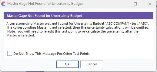 If this dialog appears, you likely need to back up in the event and select a different master or manually confirm the correct master using the Uncertainty Masters Mapping dialog. If all masters can be 'guessed' - then the Uncertainty Masters Mapping dialog is only needed to confirm the selections. Note: the 'Master Gage Not Found for Uncertainty Budget' can occur many times - especially if there are a large # of test points that use the same, Masters Rule. In this case, check the 'Do Not Show This Message For Other Test Points' box to suppress this dialog for the current event. |