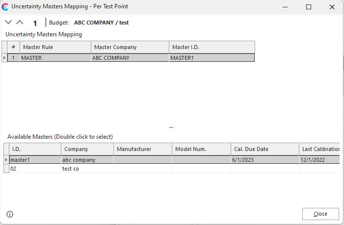 This dialog shows only one test point at a time - corresponding to the current test point selected in the event. You will note that Test Point # changing on the top of the dialog as the test points grid is navigated within the event. Each test point can map to an Uncertainty Budget, and this budget might have one or more Master Rules requiring the association of a master. These Master Rules for the current test point are shown in the top grid. The rule's name is in the first column ('Master Rule'), and the associated master is shown in the 'Master Company' and 'Master I.D.' columns.