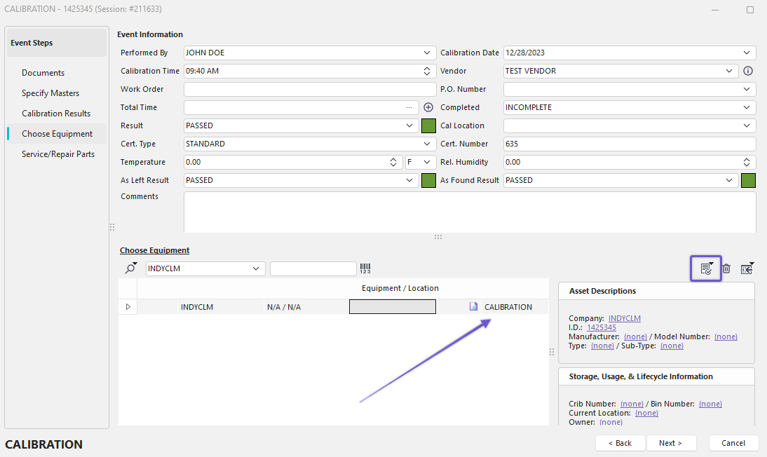 Performing an Event - Choose Equipment Field - Conditions