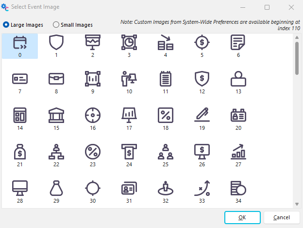 IndySoft includes 109 button icon images for your use. You can assign up to 10 custom images in the system, which can also be used as event images.