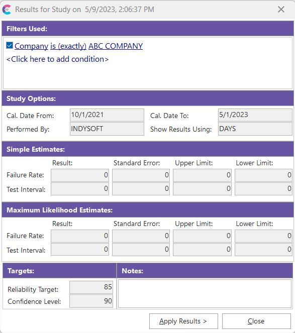 Once a study is completed, this dialog will display the resulting interval estimates and a reminder of study setup options: