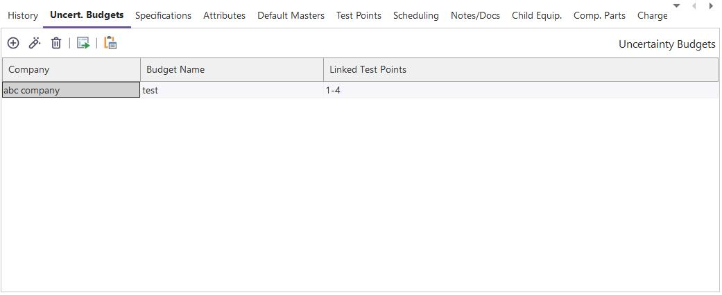 ·Uncert. Budget Company / Uncert. Budget Name Fields in Test Point setup grid.