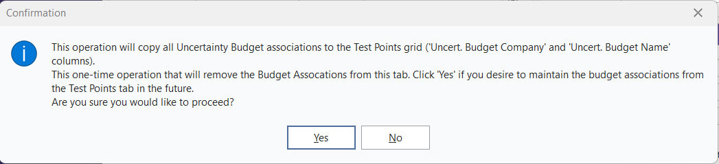 So once this one-time operation is performed, the mappings now live in the Test Points grid, and it is assumed that you will NOT be tracking them through the 'Uncert. Budgets' tab. However, it is important to remember if a scenario exists where Uncertainty Budgets are still mapped using the 'Uncert. Budgets' tab for an asset AND Uncertainty Budgets are specified in the Test Point setup grid for the same asset... then the 'Uncert. Budget' tab associations will win. In this situation, when any event is run where Uncertainty calculations are relevant for this asset, you will see the alert below upon event startup: