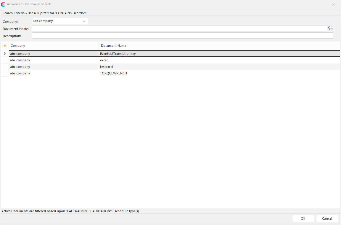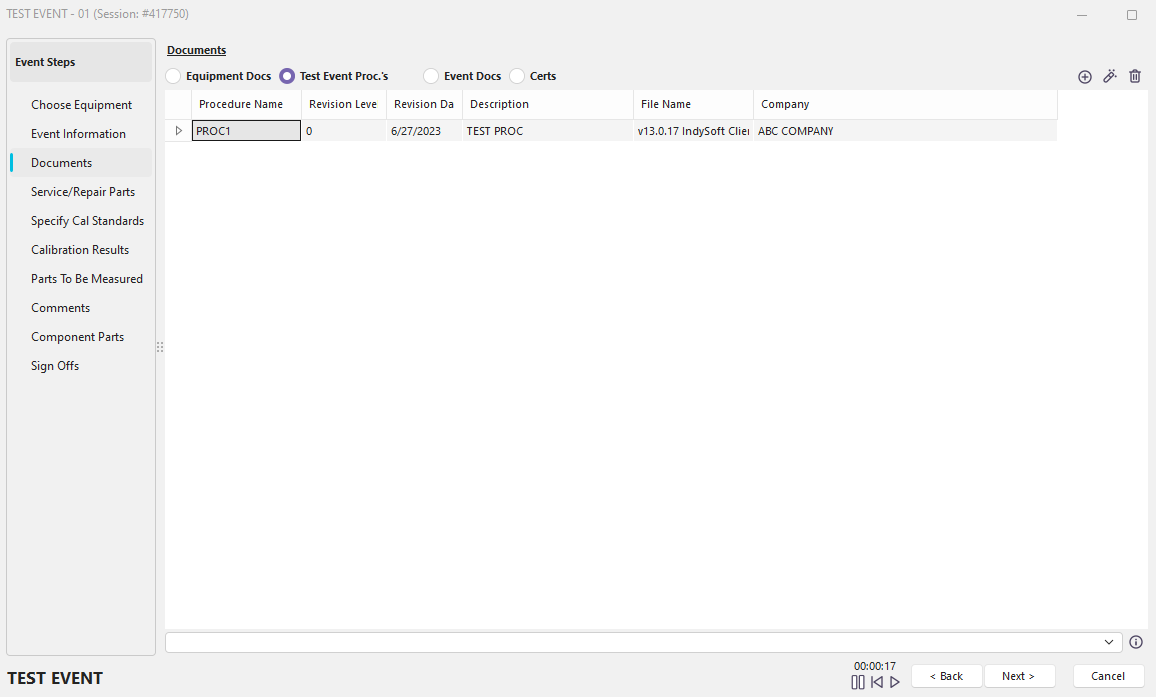 When this document type is selected, the grid will be populated with a listing for the calibration procedure appropriate for the selected equipment. The calibration procedure is specified per equipment ID on the IndySoft Equipment View screen...Calibration Info. box...Cal. Procedure field.