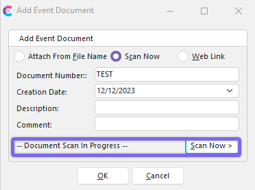 If you are scanning the event document or certificate, press the 'Scan Now' button before confirming the dialog. This will display the text 'Document Scan In Progress' and launch the Document Scanning Wizard.