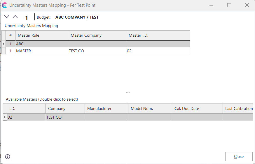 The above example shows that the 'ABC' Master Rule has failed for the currently selected test point. To calculate uncertainty correctly, the user must select the appropriate 'Master Company' and 'Master I.D.' by selecting from the masters available in the bottom grid (in this example, only one is selected in the event so far - so only one is available in the bottom grid). If the masters have already been correctly selected, this dialog should be a quick visual confirmation, then simply press "OK." As you scroll through the test points grid in the event, this screen will refresh with the master rules appropriate for the current test point. Or, you can scroll through the test points by pressing the up/down buttons on the top of the dialog. Double-click on a master from the bottom grid to automatically select it for use on the master rule above.