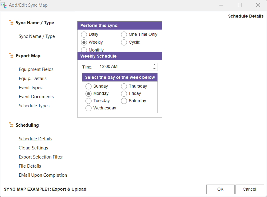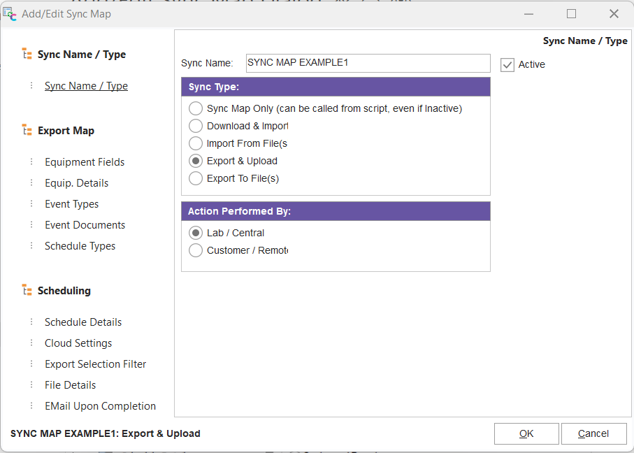 If a Sync Map is set as active, then the Schedule (as set up under 'Schedule Details') is used to set up a Windows Task to execute the sync. If a sync is not set as Active, then it still can be used for on-demand syncs through the Export/Import module or as called through script procedures.