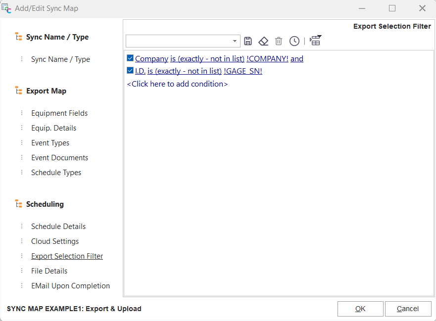 This filter controls which assets are exported with this sync map. The common filter box interface is used - as is common in many other places in IndySoft. Note that the !COMPANY! alias can automatically select the company currently on view in Equipment View on the main screen, and !GAGE_SN! can be used to return the current ID. These aliases would only be helpful if the sync were being called on-demand from an event script, etc.
