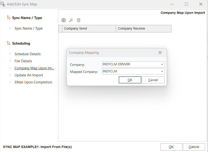 When importing assets from a different database, the company names used in the sending company might not necessarily match the company names used in the receiving database. For instance, the sending database might use generic company names like 'ABC COMPANY.' Still, the receiving company might use account numbers for companies - but they need to track the same assets. In this instance, a Company Map can be used. Press the 'Add Company Map' to add a mapping, select 'Company' for the company's name in the sending database, and 'Mapped Company' for the company's name in the receiving database. Note that a Company drop-down is shown for convenience. Still, any item can be typed into either edit - the company listing for the drop-downs matches the current database (which could be either the sending db or the receiving db - depending on the setup of the sync map). Multiple company mappings can be applied for a sync map - all will be enforced on the import file before it is executed.