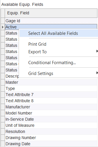 The left-hand grid displays all the available equipment-level fields for reference. The right-hand grid displays the fields selected for export using this sync. So if a field is never exported, then there is no risk of that data entering the destination database. A field can be moved from the left-hand grid to the right grid by double-clicking on the field in the left grid. Fields can also be multi-selected in the left grid, then the 'Add Equip. Field' button (>) between the grids can be pressed to move all selected fields quickly. Fields can be double-clicked from the right-hand grid to remove quickly - or the 'Remove Equip. Field' button (<) between the grids will remove the selected field from the right-hand grid. Other options are available from right-mouse click on 'Available Equip. Fields' grid: