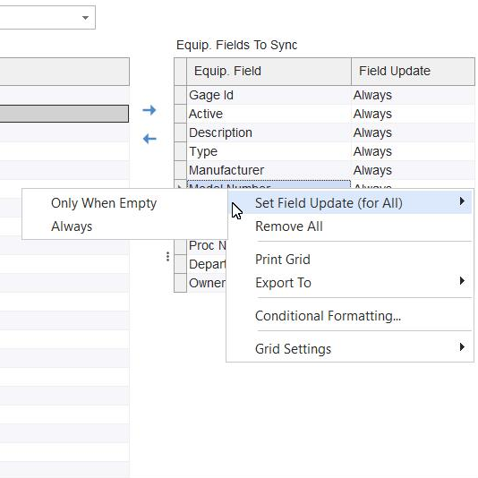 By pressing 'Select All Available Fields,' all fields can be quickly added by pressing the 'Add Equip. Field' button (>). Several options are available via right-mouse click in the 'Equip. Fields To Sync' grid, along with 'Remove All':