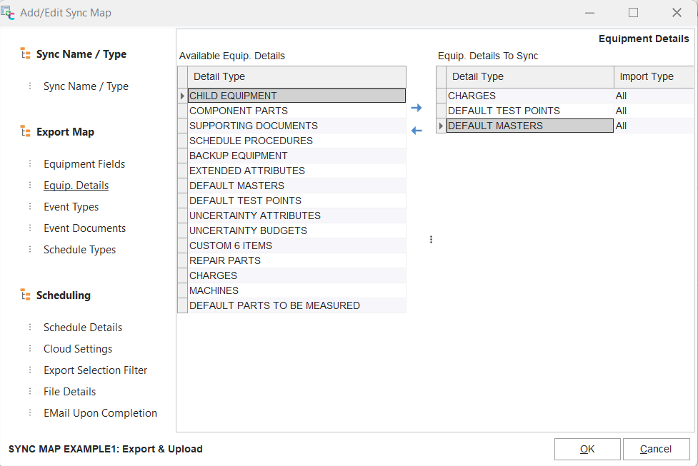 The interface is like the 'Equipment Fields' step - select the detail from the 'Available Equip. Details' grid and double-click to add it to the 'Equip. Details To Sync' grid, or double-click from the right-hand grid to quickly remove. Or, one/more records can be selected from the left grid and the 'Add Equip. Detail' (>) button between the grids can quickly add. Then use 'Remove Equip. Detail' (<) to quickly remove. History and Scheduling options are not listed - these options have their setup steps later in the Sync Map wizard.