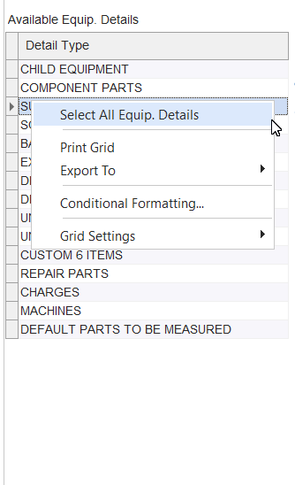 Use the 'Select All Equip. Details' right-mouse click option to quickly select all details - then press 'Add Equip. Detail' (>) to add all.
