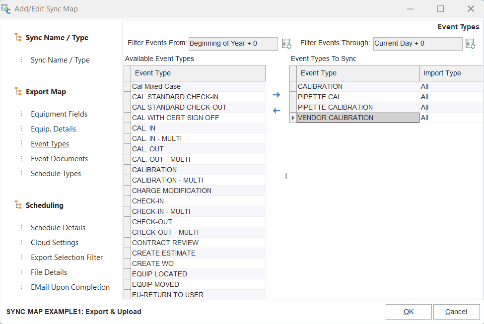Only selected event types will be included when an asset is exported with this sync map. Also, a filter of event dates can be used ('Filter Events From' and 'Event Filters Through'). The interface is like 'Equipment Fields' or 'Equipment Details' - double-click on records in the left-hand grid to add to the right and double-click on records in the right-hand grid to remove. Right-mouse click options are available for quickly selecting all items, etc.