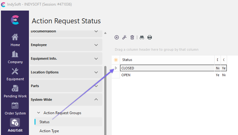 To add to or manage the System-Wide Action Request Status Lists, in the IndySoft header, click Add/Edit and select System-Wide...Action Request Lists...Status from the drop-down menu.