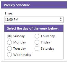 Weekly alarms are designed to run once weekly at a specified time on a specific day. To use a weekly alarm, first, select the weekly alarm selection item from the Alarm Type tab. Next, click on the Times tab and set the exact time and day of the week to execute this alarm.