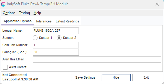 Application Settings are stored in the computer's registry running IndySoft's Fluke Dewk Temp/RH application. At the end of each polling interval (when the timer reaches 0), the saved settings connect with the Fluke 1620A hardware and then optionally alert users of out-of-tolerance readings. For information on configuring temperature and humidity tolerance, see Tolerances.