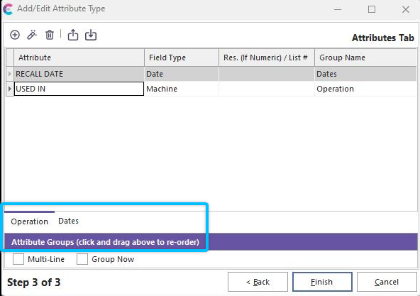 Group Name (Opt.) - if you have many extended attribute fields, you can group them into sub-tabs using this option. All distinct 'Group Name' values will be created as tabs, and related attributes will be placed on this tab. If some extended attributes do not have 'Group Name' values and other extended attributes, do, then the attributes missing 'Group Name' values will appear on a tab named '(None)'. Drag/drop the tabs from Step 3 in the Attribute Types wizard to re-arrange the tabs' left-right order.