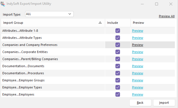 Before importing the data, you might want to preview the contents to confirm you are importing exactly what you intend. Each sub-group has a' Preview' hyperlink in the 'Preview' column and a 'Preview All' hyperlink above the grid. Both options will show a preview dialog showing all or a subset of the export file contents. See Previewing Import File Contents for more details.