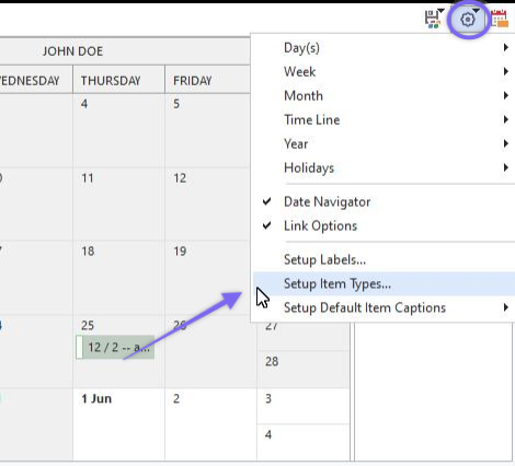The setup of Item Types depends upon security items in Profile Manager: IndySoft Calendar...Block Setup Item Types. You can also access this dialog from the Work Scheduling module 100545052Options Icon.