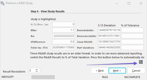 This step allows you to review the R&R and ANOVA results for the study. You can review three reports or thirteen charts to analyze the results.