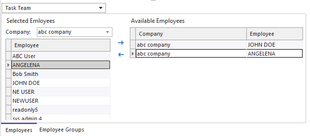 | --- || | Use this section to build a task team for the specified task. Use the blue arrows to add/subtract employees.
