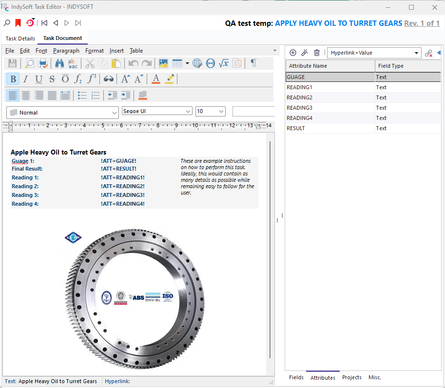 Each task has associated equipment requirements, part requirements, and schedule update rules. Fields (hyperlinks) in the process document can be quickly modified, like Equipment View and/or Template Editor. In addition, expanded interfaces can be created through the IndySoft Services Group utilizing custom scripting and project features. Any hyperlink in the task document can launch a script project. These projects can have their forms & interface, all configurable within IndySoft. These scripts can directly modify the database, or they often return a line of text to the task document itself.