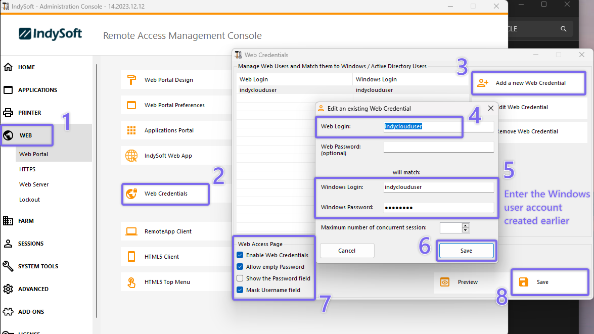Next, we will map the Windows user to a designated Web Credential in the Admin Tool. This Web Credential will always be used to start the RDP session, bypassing the need for Windows user credential entry and bringing users directly to the IndySoft login screen.