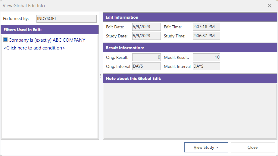 Modif. Result / Interval: The frequency and interval used in the global edit (as selected in the Edit Filters To Be Used For Global Edit dialog).