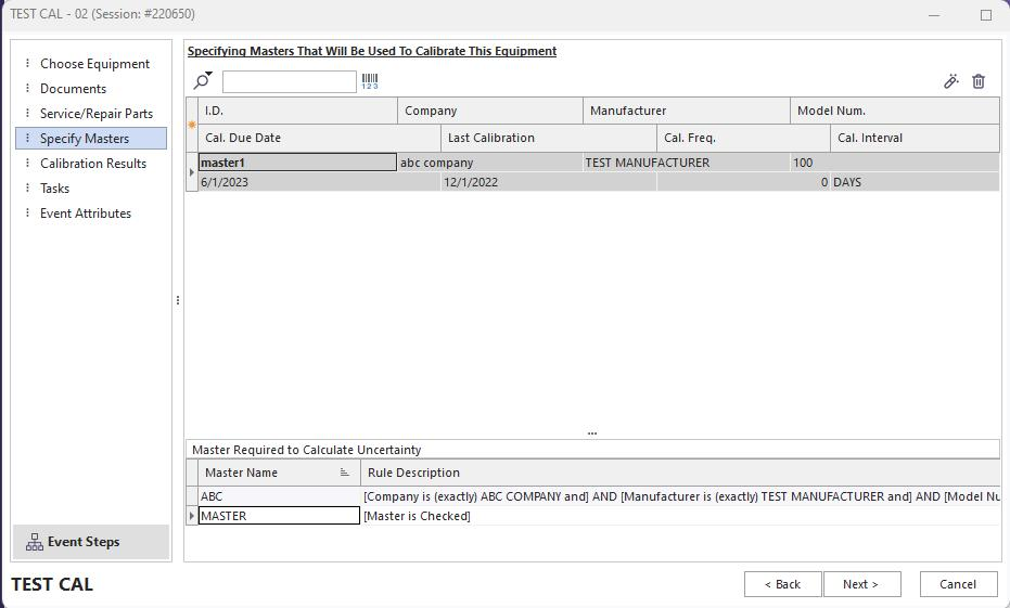 During a calibration event (or any event type that uses test points and will calculate uncertainty), it is necessary to select the masters or standards that are necessary to calculate uncertainty. These masters have been set up in the related Uncertainty Budget through the Master Rules tab. When a calibration event is performed, there might be additional masters that are required to perform the calibration beyond those needed to calculate uncertainty. For this reason, when the 'Specify Masters That Will Be Used to Calibrate This Equipment' tab is viewed, a listing of masters required for uncertainty calculations is listed at the bottom of the page. This grid lists all the master rules and rules descriptions for each uncertainty budget associated with the selected equipment and test points. This grid will be blank if you have not yet selected equipment for the event. This 'Masters Required to Calculate Uncertainty' grid is provided as a visual note when selecting masters to ensure all appropriate masters are selected. It is advisable to have your 'Specify Masters...' event tab appear before your test points tab when calculating uncertainty - since the exact master's attributes could be referenced within an uncertainty budget when uncertainty is calculated from the test points tab.