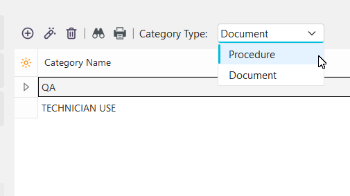 You can switch between the category lists (Documents vs Procedures) by using the 'Category Type' dropdown in the menu: