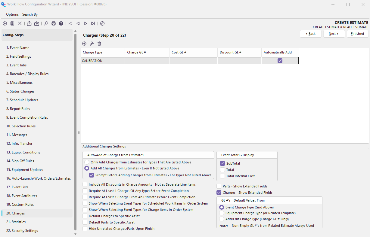 In my example, I have set up the CALIBRATION charge type to automatically add to the event if it exists at the equipment level. At this point, my event contains everything that is needed to create an estimate, and I can save the event in workflow config.
