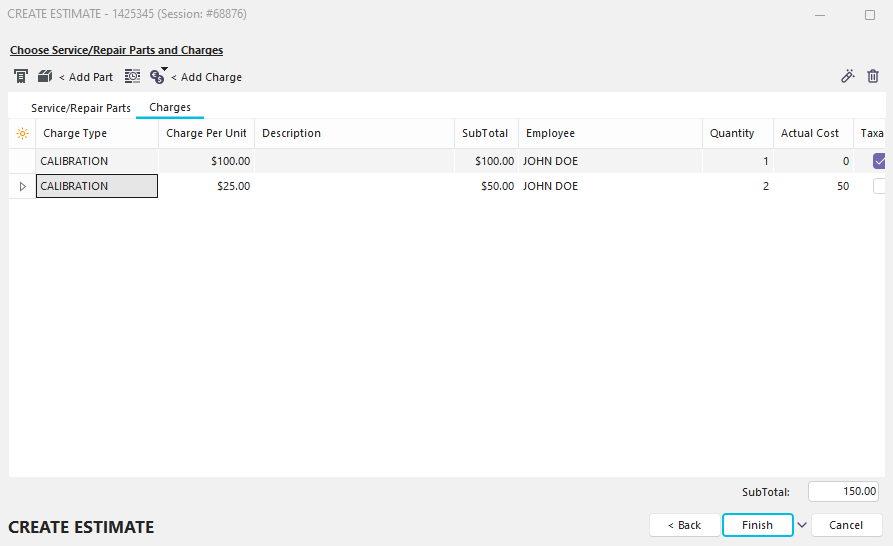 The Order System tab will now display the newly created Estimate - #14 with the associated charges