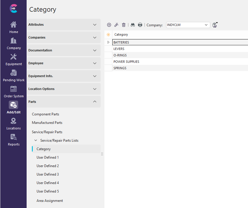 To add to or manage the Category list, click on Add/Edit in Dashboard View and select Parts -> Service/Repair Parts Lists --> Category from the drop-down menu.