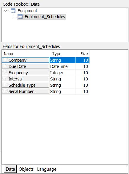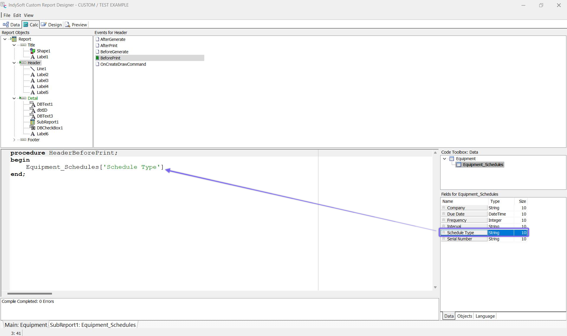 As a pipeline is selected in the Data outline tree, that pipeline's fields are displayed below. These fields are read-only - for reference. The fields can be modified for Custom reports through the main Data tab. For event-related reports, the # of fields is defaulted by IndySoft and cannot be modified. The fields can be modified for Equipment and General reports by selecting additional fields into the preview grid before entering the Report Designer. The Properties section on the Calc Tab - Data tab is helpful because it allows field references to be dragged/dropped into the Calc tab code. Note the small dots to the left of each field - drag from this field title into the appropriate position in the Calc tab code: