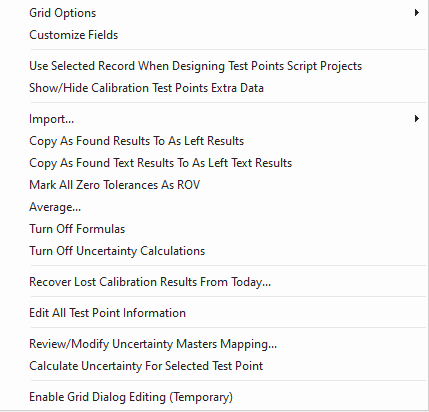 Finally, there are several options available when you right-mouse click within the test point grid: