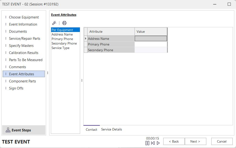 The 'Event Attributes' event step appears if the 'Event Attributes' event step has been selected for the current event type through the Event Configuration Wizard - Event steps.