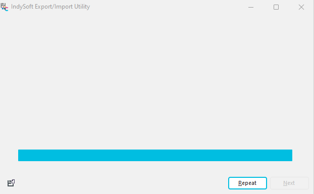 Once all filters have been completed, IndySoft will prompt for the file name location (if saving to file) or email address(es) (if attaching the export to an email), then the Export will begin. You will see a progress dialog similar to the one below. The import is complete when the bar reaches 100 percent. After completion, press 'Repeat' to return to the start page and perform additional operations.