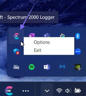 The IndySoft external logger application runs on one computer directly connecting to the external logger hardware. The software runs in the System Tray. If you want to modify the setup options for the IndySoft external logger Application or exit the program, right-click the System Tray icon and select the appropriate option.
