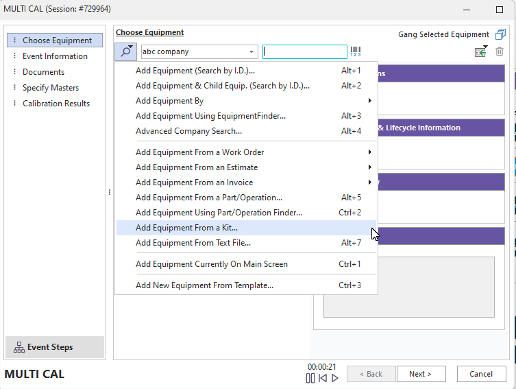 There are two ways to select a kit from within an IndySoft event. First, you can use the 'Add Equipment From A Kit... (Alt+6)' menu option available from the button: