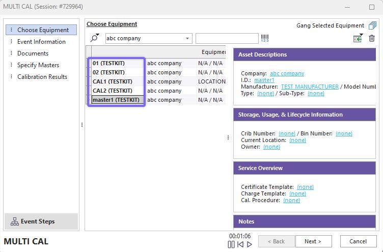 Note: When equipment selected from a kit appears in the 'Choose Equipment' grid within an IndySoft event, you will see the name of the kit used for selected listed in parentheses after the equipment ID. For more information on event configuration, please see the Workflow Configuration section.