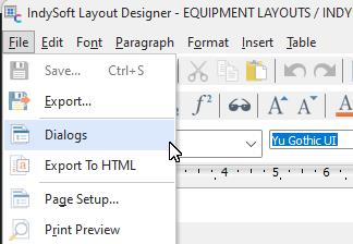 To find and edit the 'Dialogs' dialog, go to the 'Home' tab of the IndySoft Layout Designer and navigate to the upper left corner. Here, under the 'File' tab, we will see a button labeled 'Dialogs.'