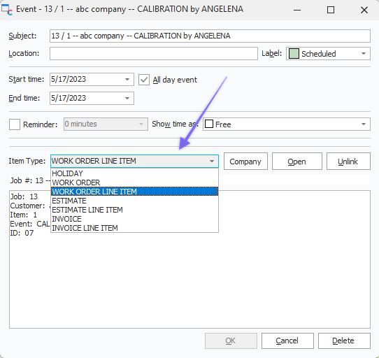 To access information about a work order, double-click on it in the grid (see Grid View). Use this configuration dialog to set up additional item types - this is useful for ad-hoc scheduler items. By default, there are six types of 'WORK ORDER' and 'WORK ORDER LINE ITEM,' 'ESTIMATE' and 'ESTIMATE LINE ITEM,' 'INVOICE' and 'INVOICE LINE ITEM' - these item types cannot be removed. The selection of an item type is only relevant for ad-hoc calendar items: