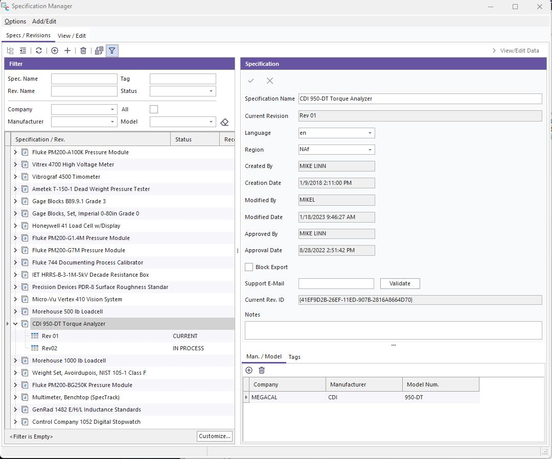 The SpecManager allows users of IndySoft to standardize the entry of specifications and uncertainty information across multiple devices. When the information is standardized, it facilitates the ability to swap-out standards and use the same uncertainty budget. If you have one instrument that lists ‘VOLTS_DC’ and another uses ‘DC Volts’, the uncertainty lookup functions see those as two completely different things and the instruments will not be able to be swapped without modifying the uncertainty budget. If done properly, your uncertainty budget should be able to use any instrument that meets the acceptance rule - and to do that, the specification must be consistent.
